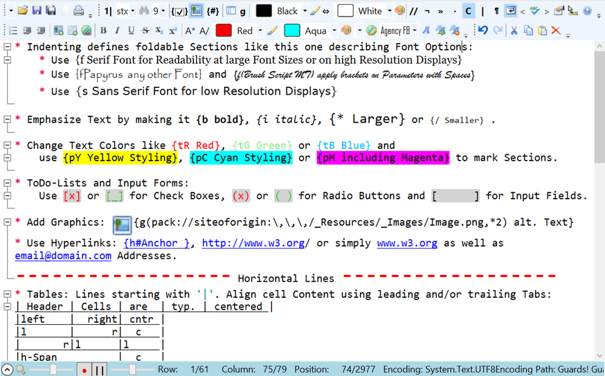 Hier sehen Sie den Editor mit einem Text-Beispiel, das einige der Möglichkeiten demonstriert: